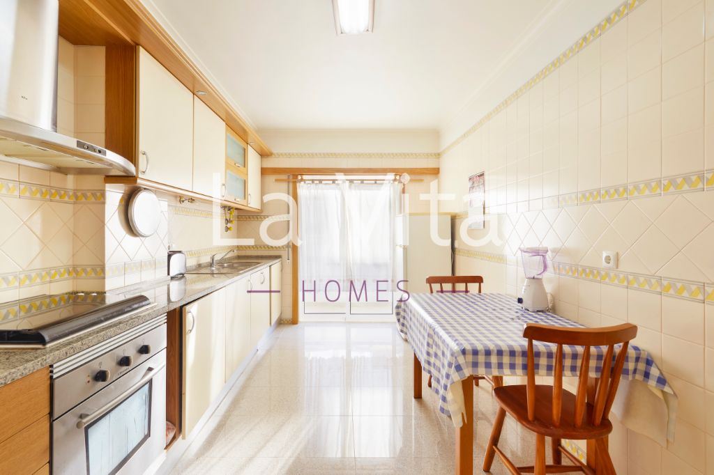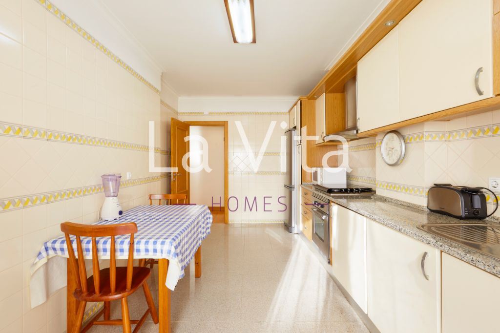 Sala comum ampla com aproximadamente 30m2 com varanda e vista de mar, com chão em madeira, Cozinha totalmente equipada com 13m2 e zona de lavandaria.