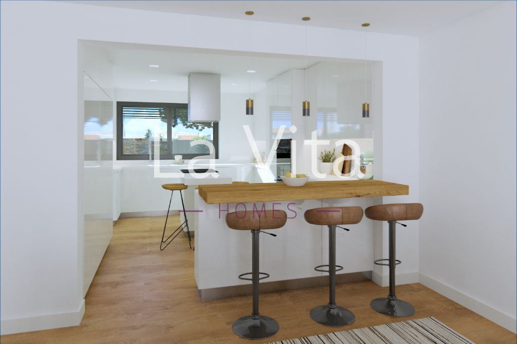Piso 0 – hall de entrada, sala ampla e luminosa com 34 m2, cozinha integrada com 16 m2 e Wc social. Tanto a sala como a cozinha dão acesso a um simpático alpendre, onde poderá desfrutar de momentos únicos em família.