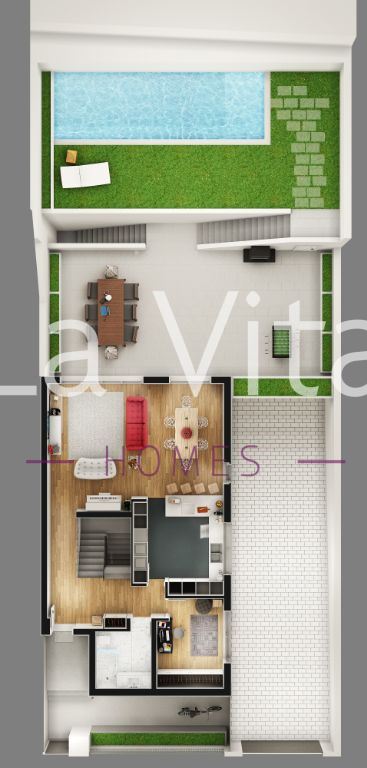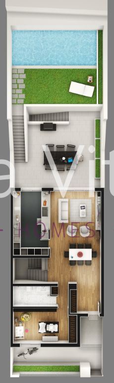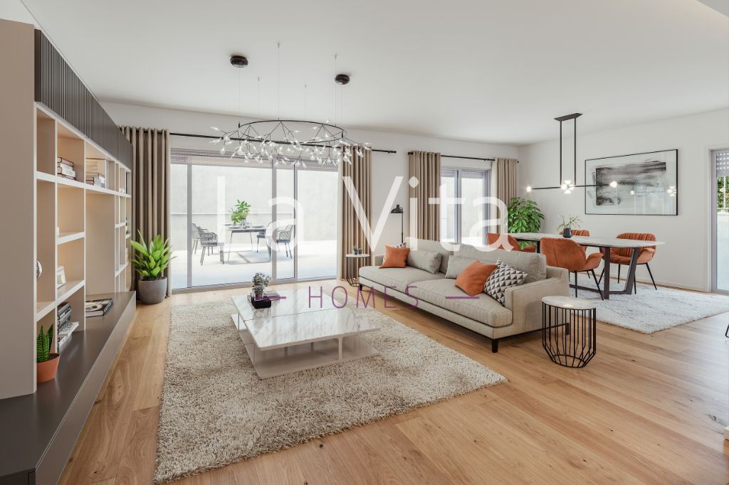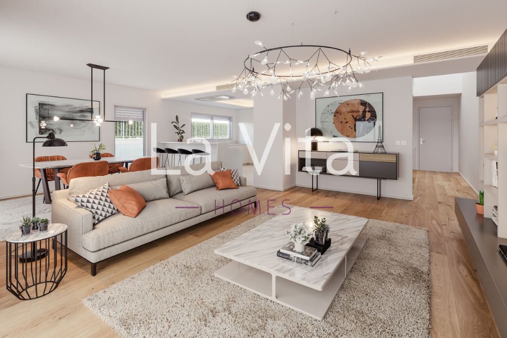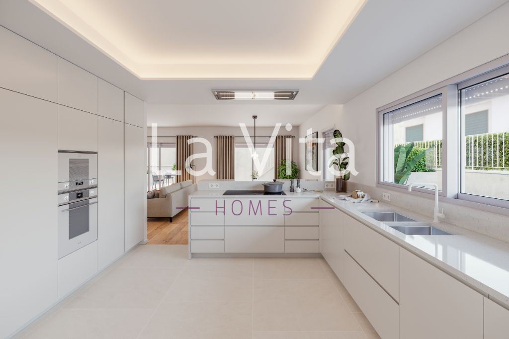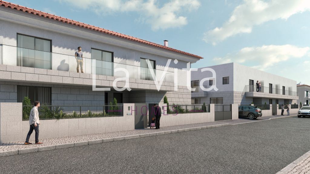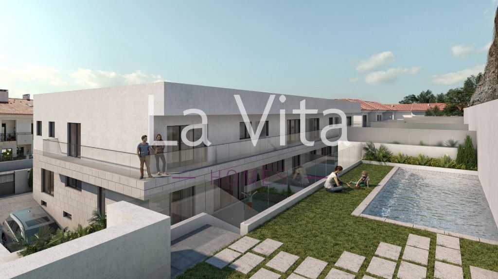 R\chão: Átrio de entrada, hall, escritório, wc, sala, cozinha equipada, terraços com áreas entre os 43 e 72 m2, jardim com piscina.