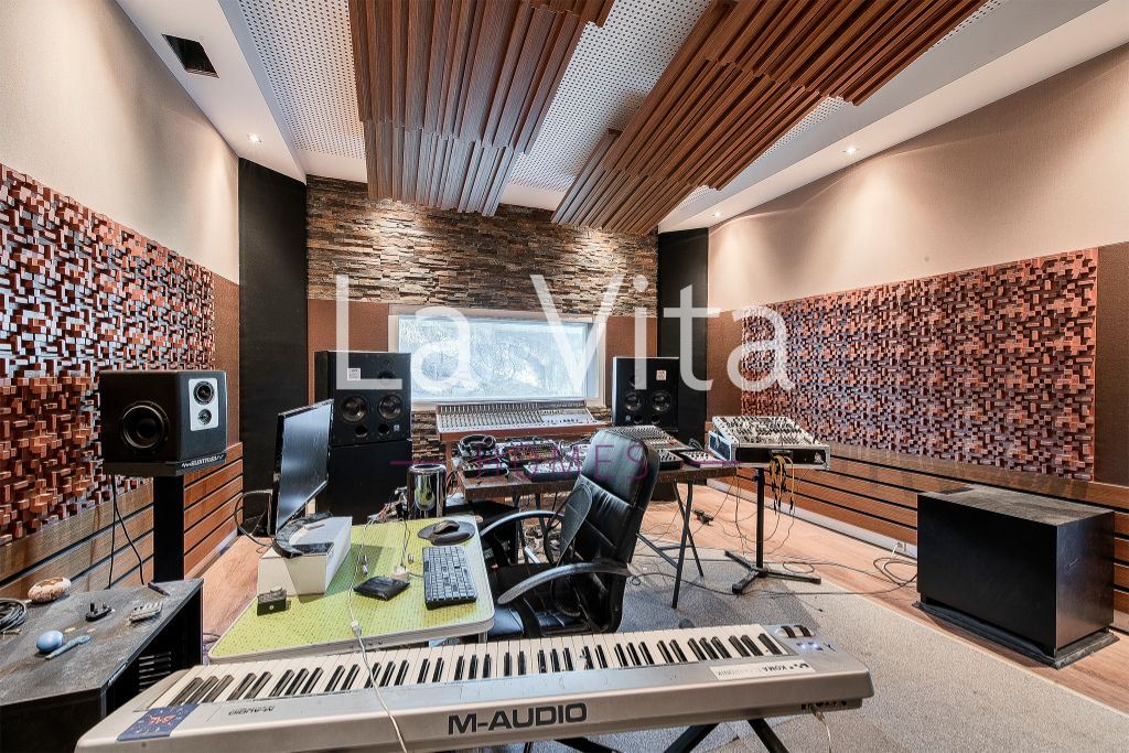 A propriedade conta ainda com garagem, estúdio de som afastado da casa, jardins e uma agradável piscina.