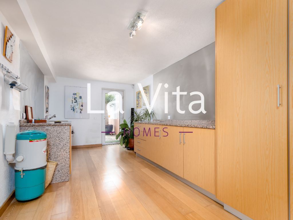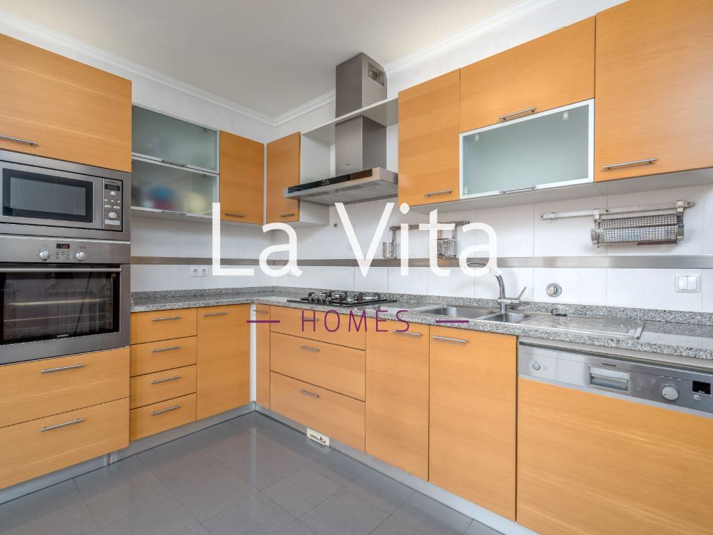 Quando entra em casa, depara-se com um luminoso e espaçoso hall, que lhe dá acesso a uma ampla sala comum com 43m2, com portas de vidro para o jardim e no lado oposto portas de vidro de acesso à varanda, o que lhe confere uma luminosidade ímpar. Neste piso encontra também um Wc, um quarto e uma cozinha totalmente equipada, com electrodomésticos embutidos e de gama alta.