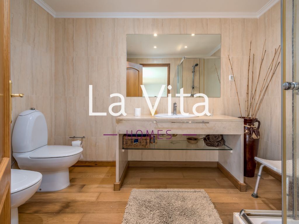 No andar de cima, encontrará um hall espaçoso que dará acesso aos quartos, todos com enormes roupeiros embutidos com 14 e 18m2, ambos com varanda privativa. A casa de banho que lhes dá apoio, tem 7m2, banheira de hidromassagem e janela. A suite, conta com 23m2 de área útil e enormes janelas.