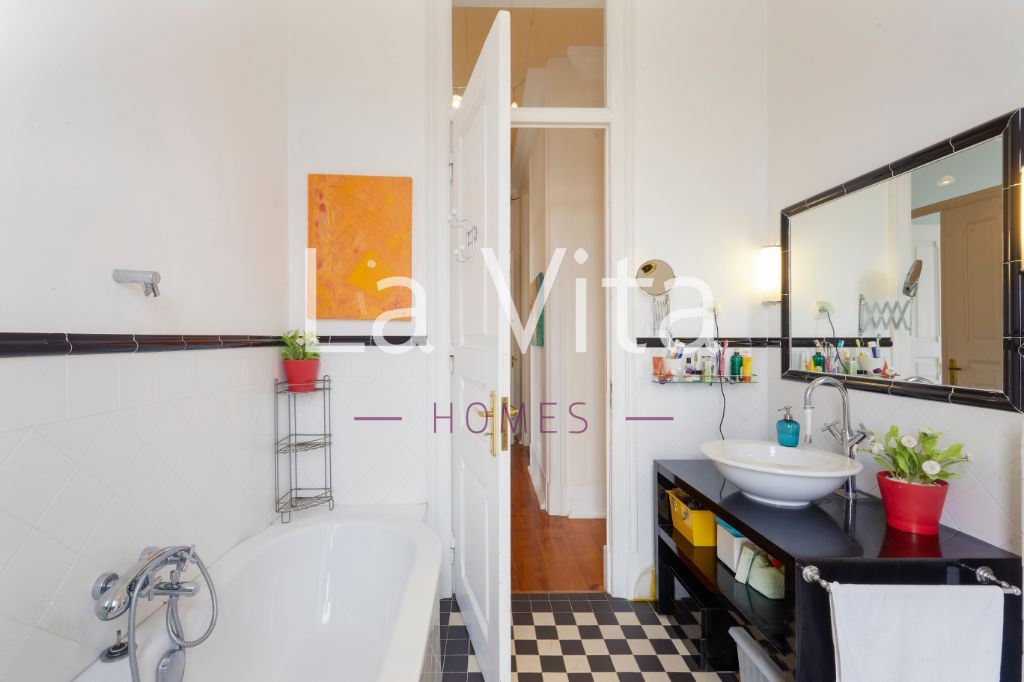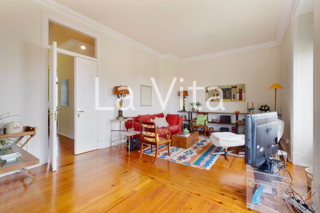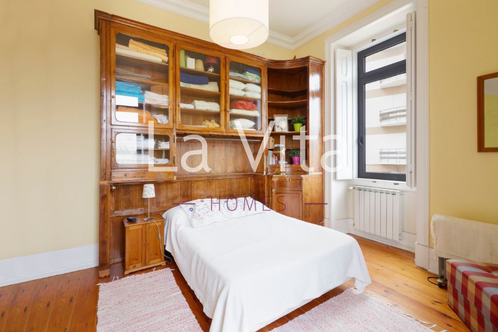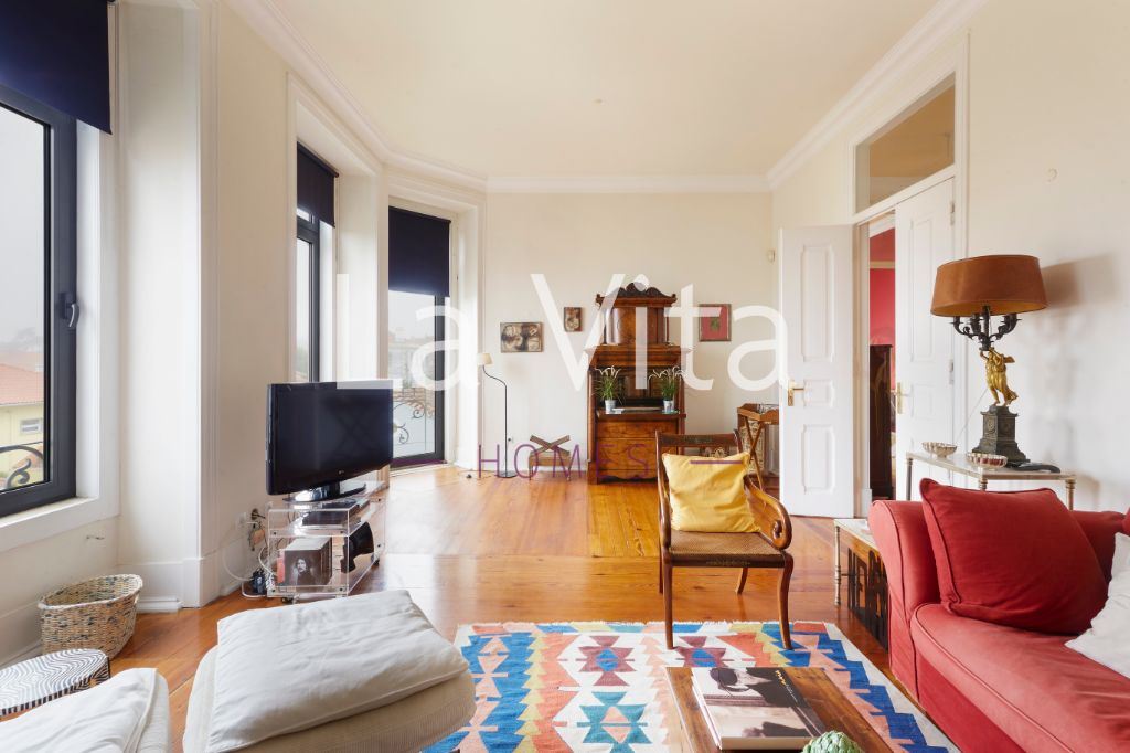 Com áreas extremamente generosas e com um pé direito com cerca de 3,5m de altura, característico da época, este apartamento apresenta o chão em tábua corrida, janelas enormes, com vista frontal de mar.