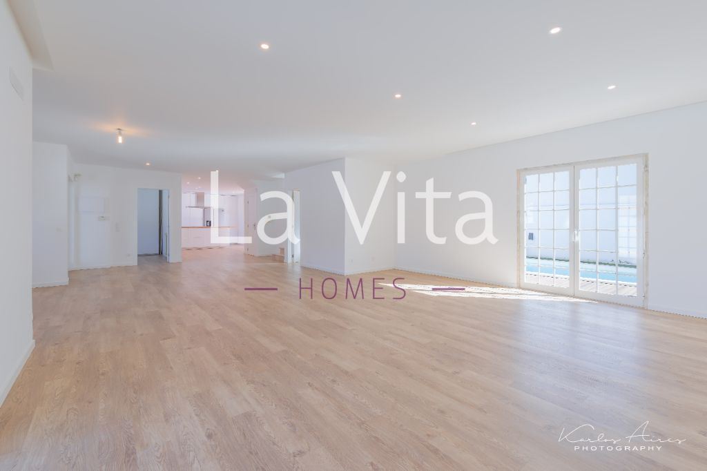 Piso 0 - Sala com 61 m2, cozinha totalmente equipada, wc completo, 1 quarto e acesso á piscina da sala e cozinha.